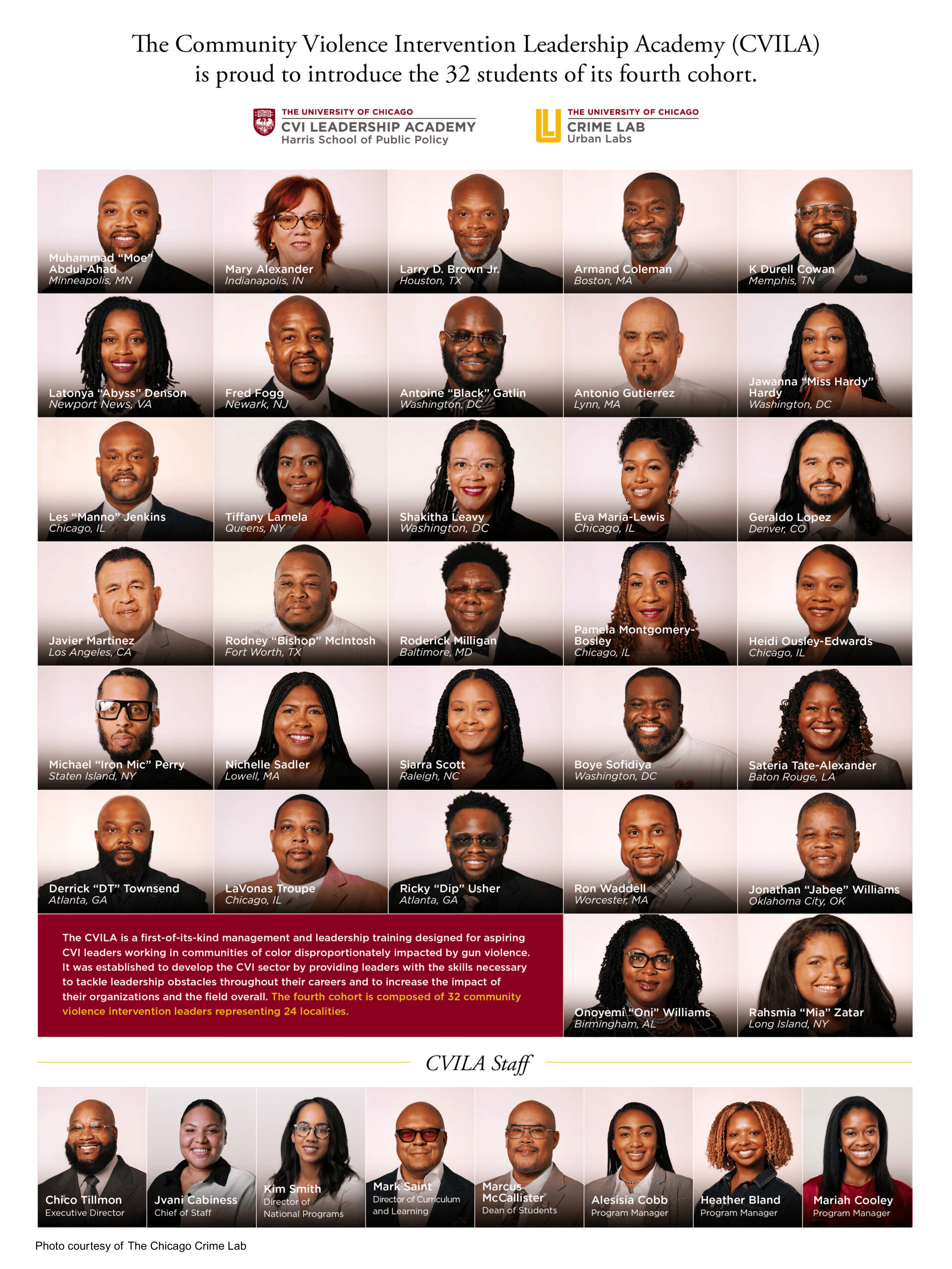 The fourth cohort of the Chicago Crime Lab’s Community Violence Intervention Leadership Academy (CVILA) is set to graduate this November in Atlanta and will be recognized for their outstanding contributions to the field. A pair of Communities Partnering 4 Peace (CP4P) leaders representing the Institute for Nonviolence Chicago (INVC) and Together Chicago are among those in the graduating class.