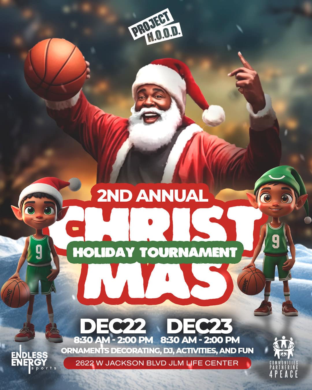 Come watch the 2nd Annual Christmas Basketball Tournament, bringing together Southside and Westside teams in a friendly, holiday tournament with prizes. We will also have ornaments to decorate and take home for the upcoming Christmas holiday. Come join us for refreshments, a DJ, activities and fun!