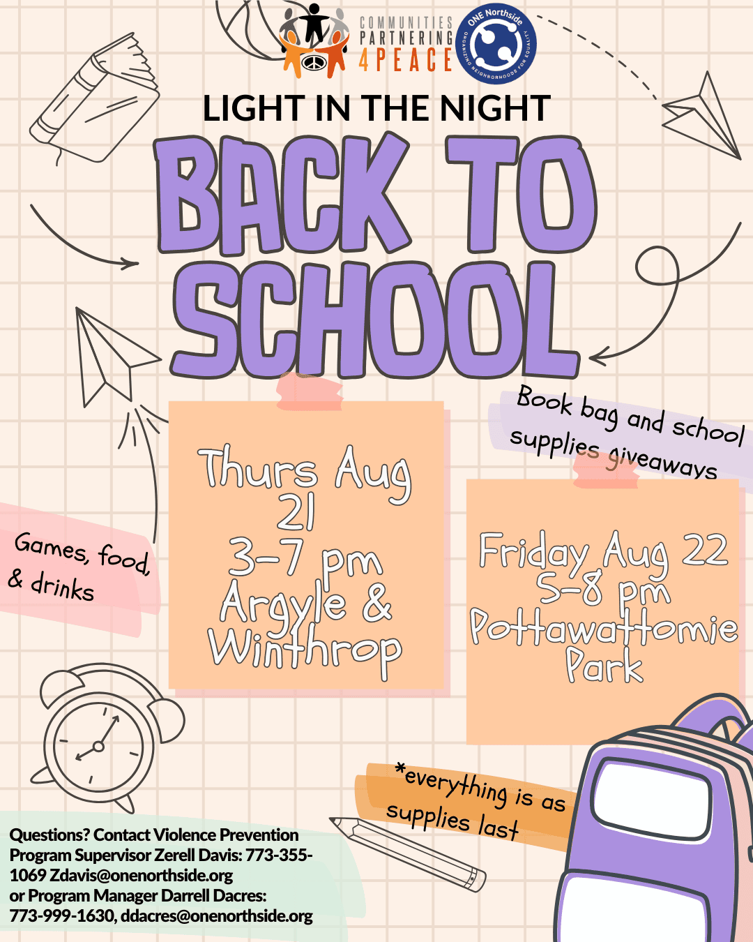 Families are invited to this fun event celebrating Back to School! We will have bookbags with school supplies to give away, games, music, food and drink. All items are first come first served. ________