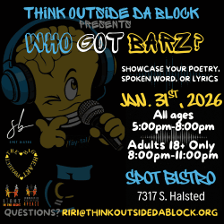 π€ Think Outside Da Block Presents: Who Got BARZ π Spot Bistro β 7317 S Halsted St, Chicago, IL 60621 π Saturday, January 31, 2026 π All ages 5:00 PM β 8:00 PM. Adults 18+ only 8:00 PM β 11:00 PM.