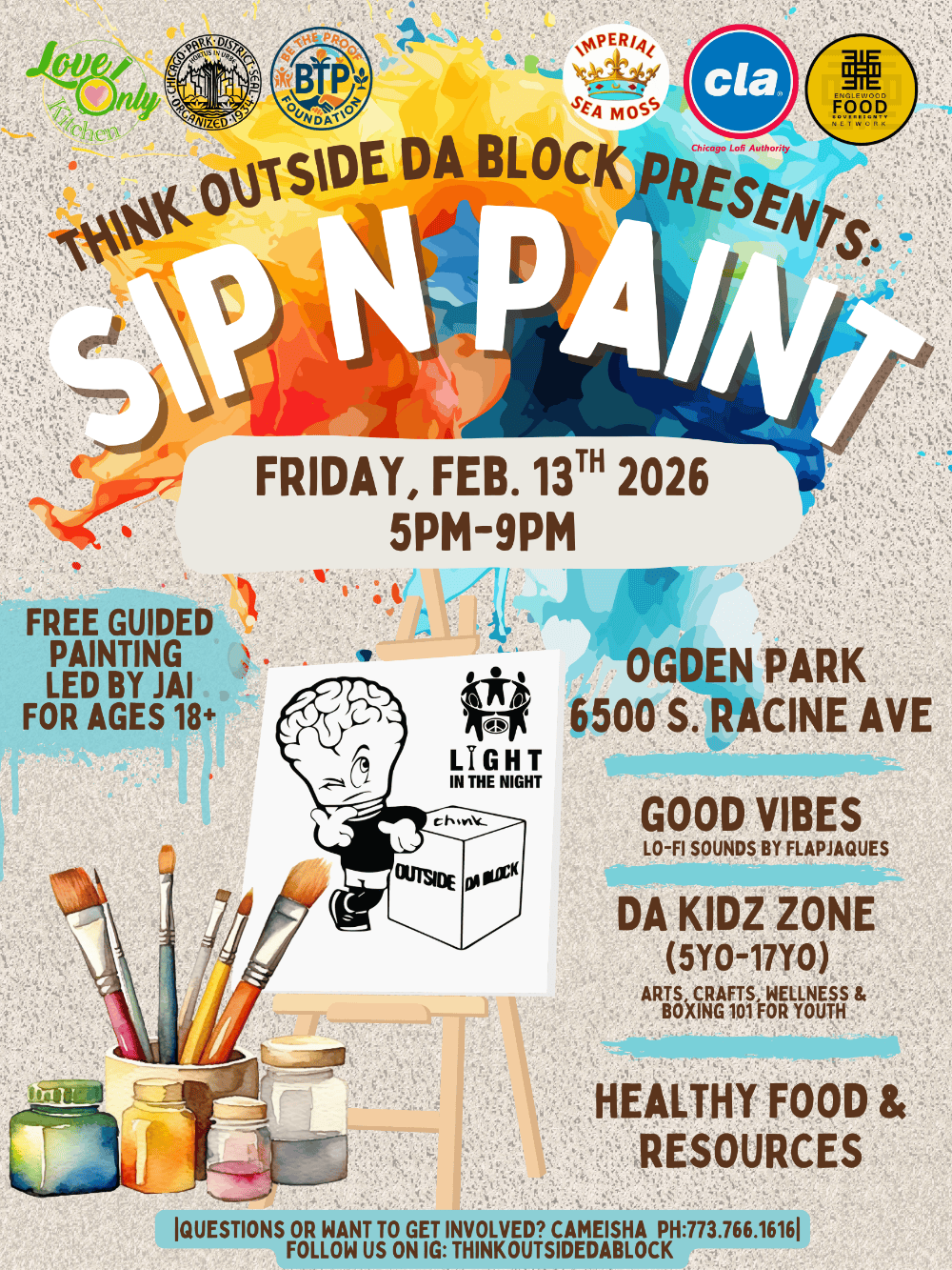 A relaxing community sip & paint experience featuring guided painting and refreshing sea moss lemonade, promoting creativity, connection, and wellness, providing free food and resources as well.