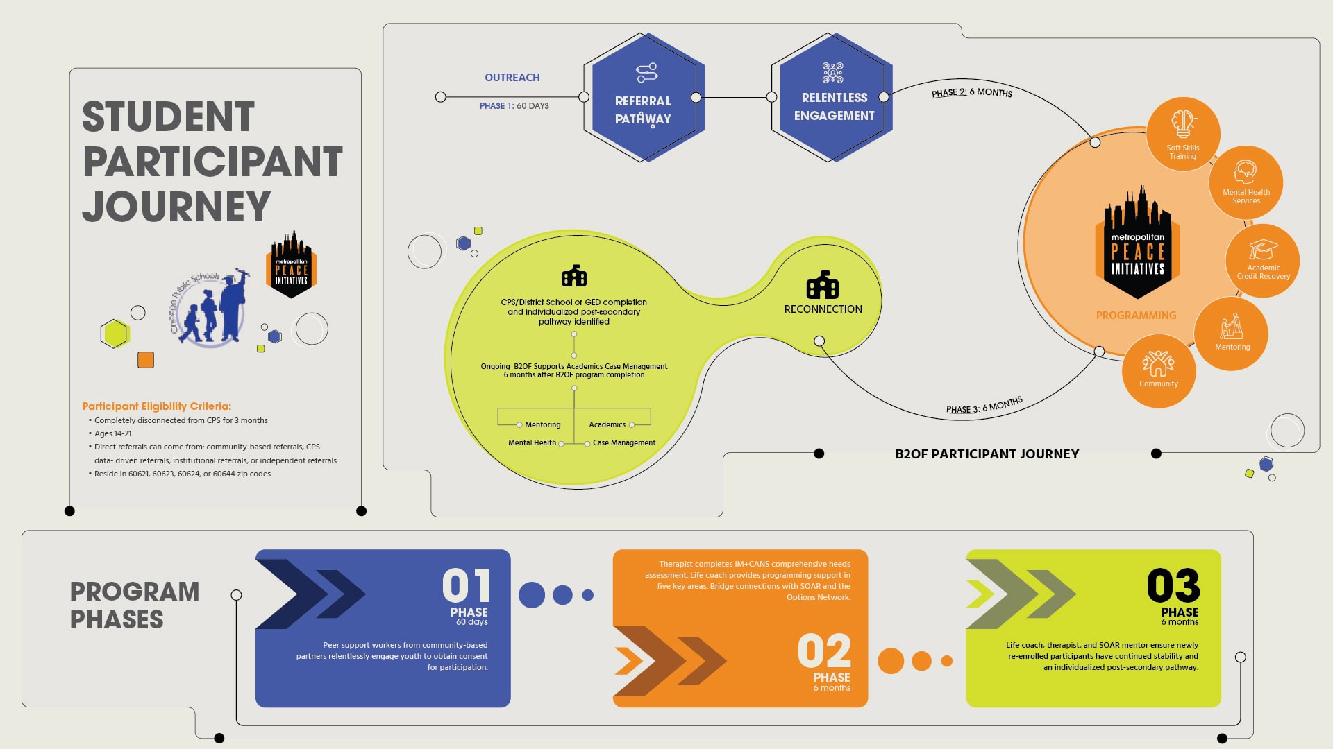 Back to Our Future 2.0 (B2OF 2.0), in partnership with Chicago Public Schools, is the first program under the initiative. The overall goal of B2OF 2.0 is to re-engage youth ages 14 to 21 on Chicago’s South and West Sides who have been disconnected from school for three or more months. The program aims to help youth become less prone to violence and violent activity, while reconnecting them to the educational pathways that best suit their needs.